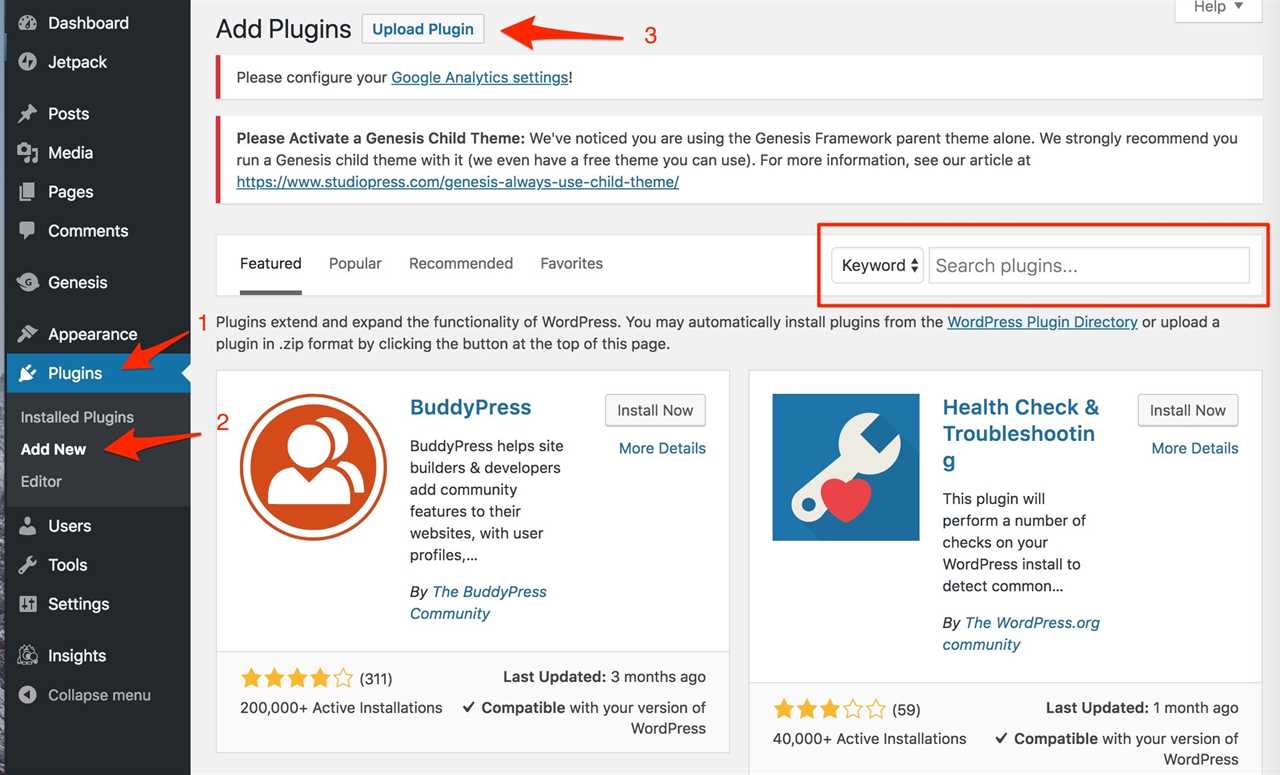 Alternatively, you have the option to upload a plugin you have purchased or downloaded from a third-party site. To do this, see the “Step 3” arrow in the picture above. All you have to do is click “upload plugin” and you’ll be asked to upload the ZIP file of the plugin that you downloaded from the third-party website.